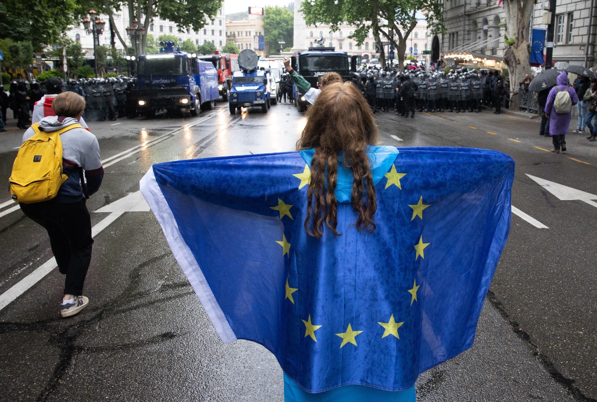 一名抗议者在第比利斯议会附近的反对外国代理法案集会上面对防暴警察,5月14日。