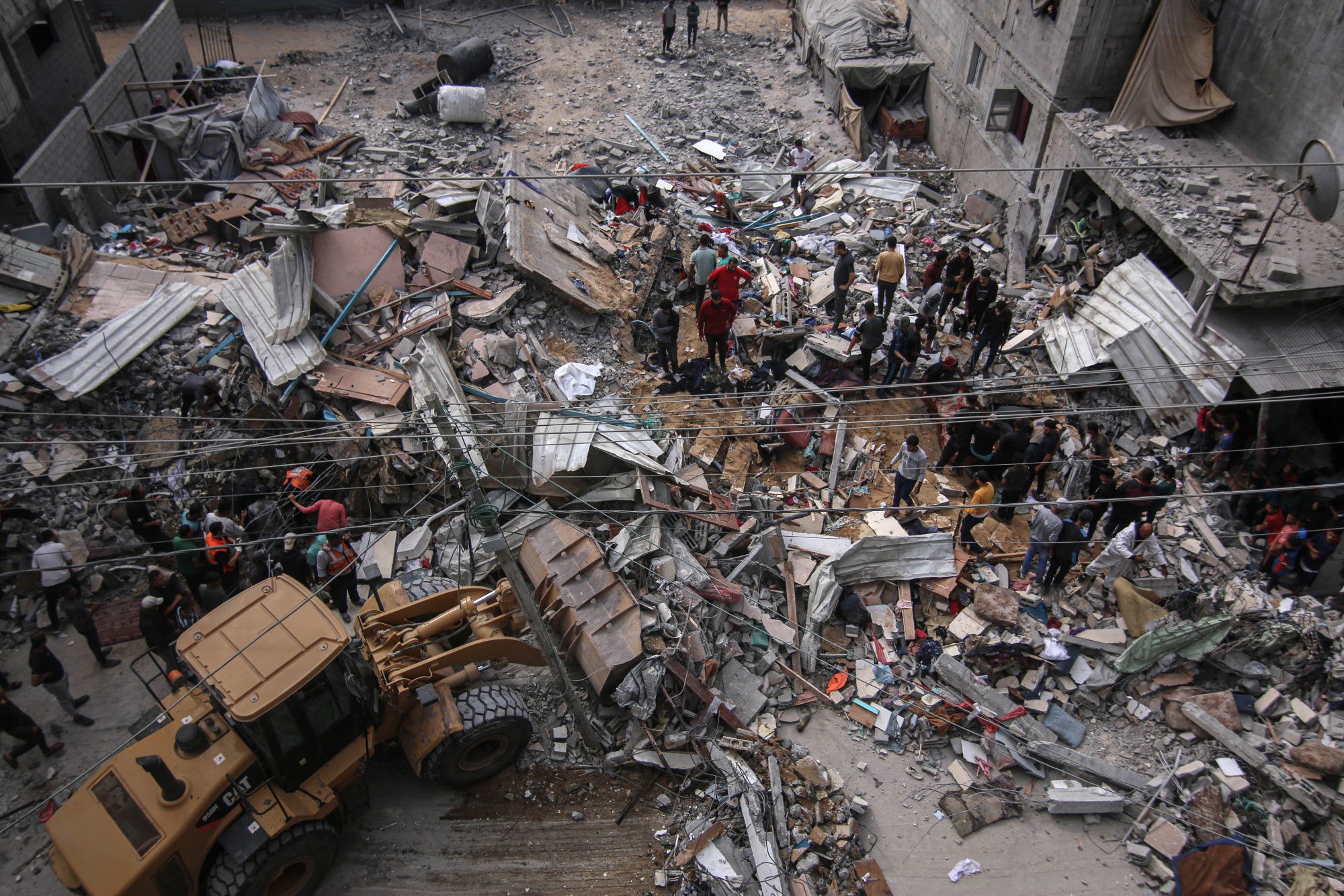 巴勒斯坦人在上周以色列空袭中搜寻加沙中部难民营的废墟。