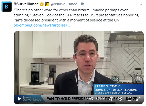 美国对伊朗总统伊布拉希姆·莱西去世表示慰问,这让外交关系委员会的史蒂文·库克感到不解,尤其是自从莱西在上世纪80年代末处决数千名政治犯后被称为“德黑兰屠夫”以来。“令人震惊,”他今天说,同时也很幼稚,因为这表明美国仍在试图亲近伊朗,尽管其支持哈马斯等行为。
