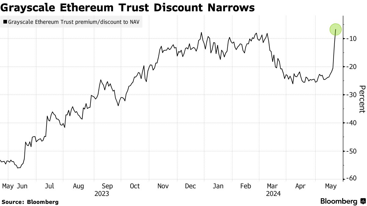 彭博社编制的数据显示,该基金对其基础以太币持有的折价已经从上周的20.5%缩小到不到7%,去年曾高达56%。类似的模式在SEC批准Grayscale比特币信托基金转换为ETF之前的一月份也出现过,该基金现在与其基础资产持平。
