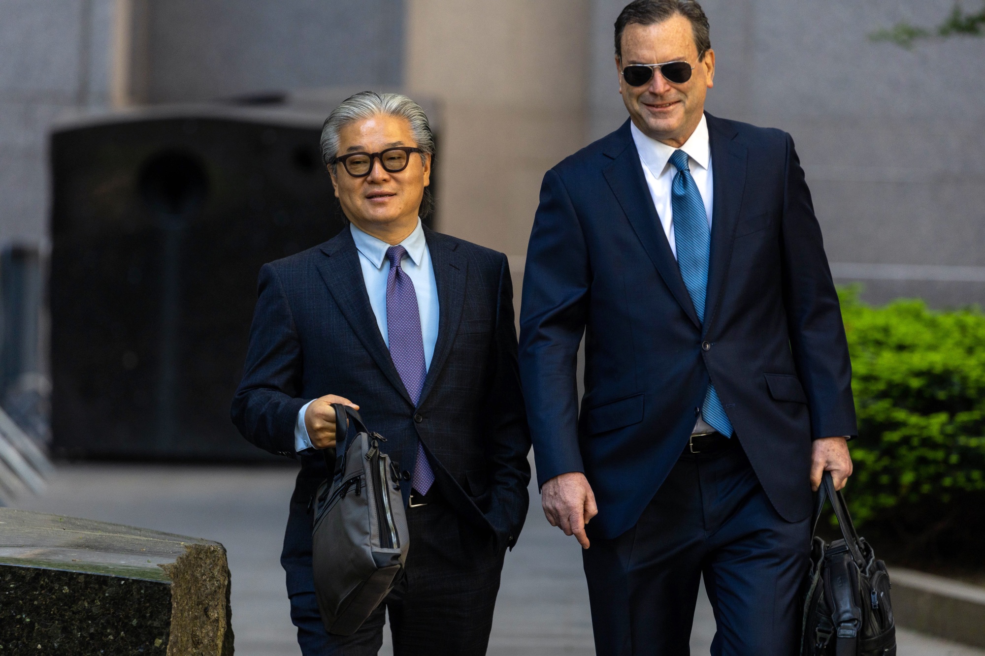 比尔·黄(Bill Hwang)左,于5月20日抵达纽约法院。摄影师:亚历克斯·肯特/Bloomberg2021年3月,当安达基斯资本管理公司提到潜在的保证金追加时,瑞士信贷采取了“非常温和的口吻”,而摩根士丹利则“更加严厉,愤怒”。