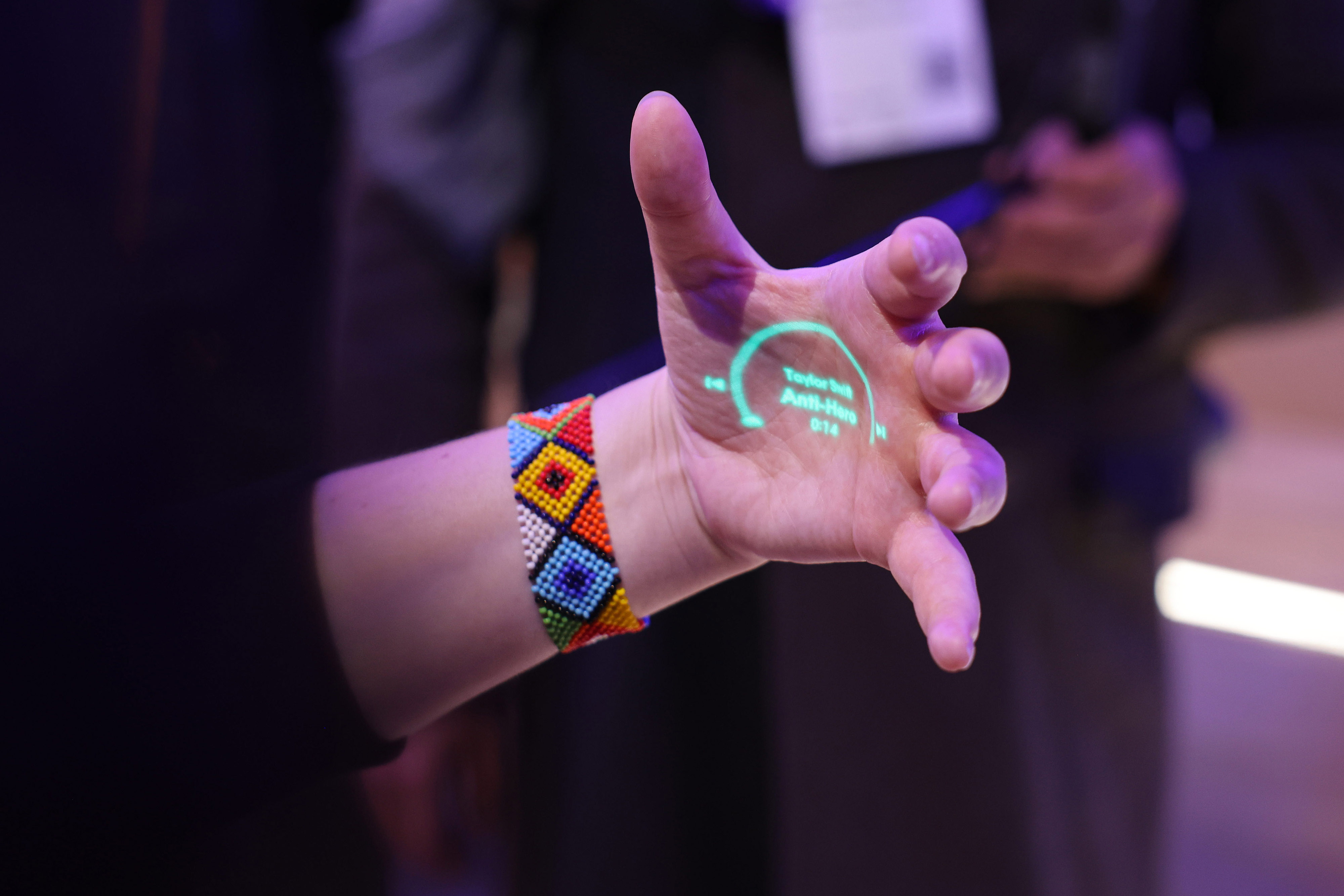 展示可穿戴Humane Inc. AI徽章的激光墨水显示投影。