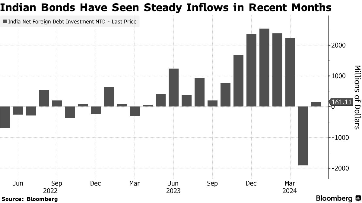 “在接下来的三到四个月里,市场将为指数纳入定价任何需要定价的内容,”印度ICICI普天管理的超过900亿美元的债务首席投资官Manish Banthia在一次采访中表示。“美国利率上升有点制约了定价部分。一旦美国利率下降,定价将更好,而且这种定价不会花费很长时间。”