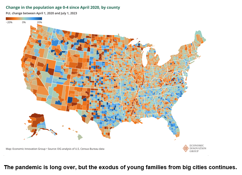 这项研究基于本月初发布的美国人口普查局数据,显示大城市仍在努力应对疫情后的影响,这场疫情引发了城市居民向较小城市、郊区和乡村的大规模外流。虽然小孩的离开速度正在放缓,但家庭的持续流失凸显了所谓的城市末日循环的风险,因为城市努力留住其中最重要的人口群体之一。