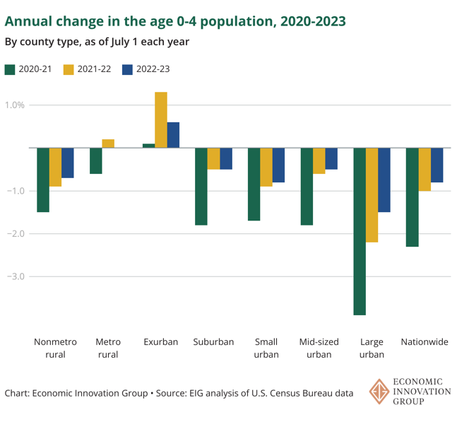来源:EIG去年大城市县约有80万人搬离,是疫情前的两倍速度,EIG表示。城市人口的减少与出生率下降相结合,拖累了大城市县的幼儿数量。EIG发现,过去十年左右,那里的出生率下降速度是农村地区的两倍。