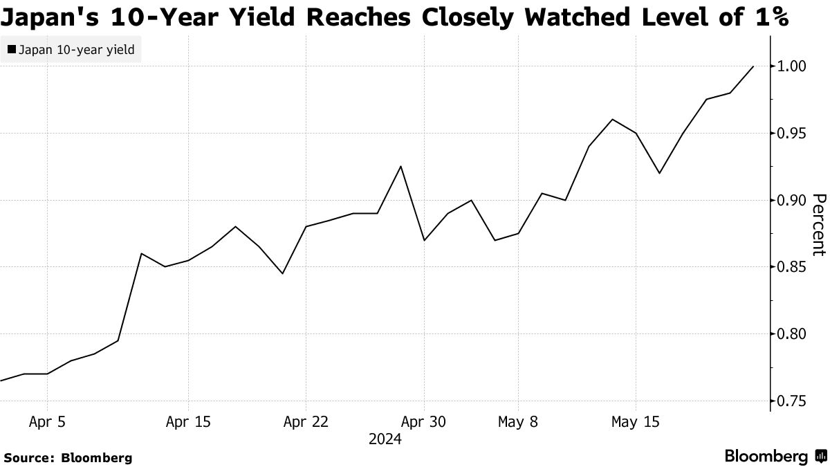 日本10年期主权债券收益率首次自2013年日本央行加大前所未有的刺激措施以来达到关键的心理水平1%。
