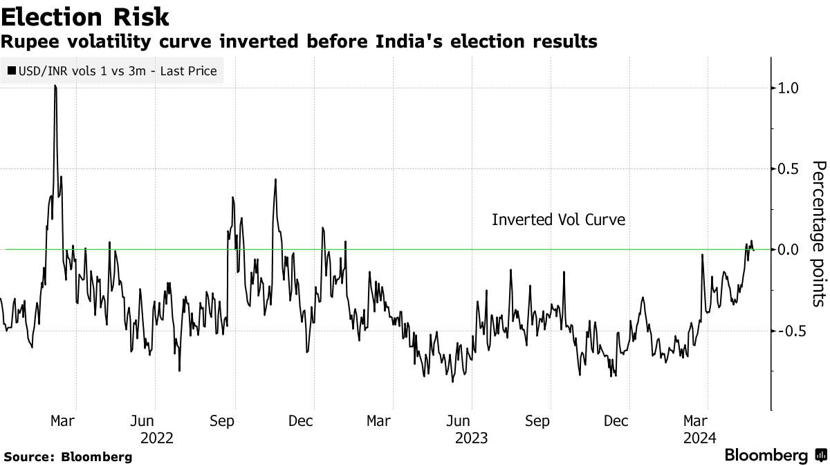 “印度卢比的隐含波动率和期权市场的偏斜已经开始反映出,”包括Claudio Piron在内的策略师在一份备忘录中写道。然而,卢比仍然保持在一个狭窄的范围内,实现波动率接近几十年来的最低水平,表明市场预期央行将在选举结果公布后保护货币免受大幅波动的影响,他们写道。