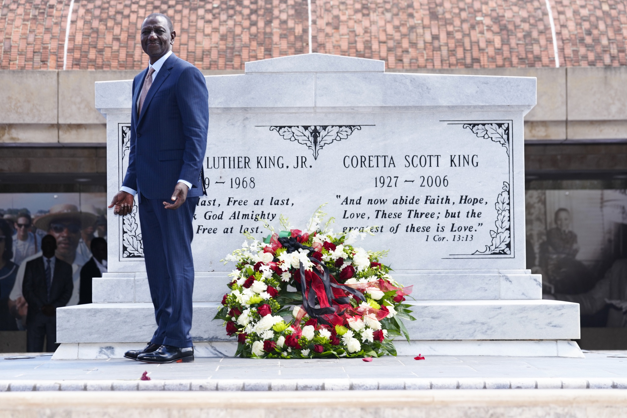 威廉·鲁托在5月20日访问亚特兰大,向马丁·路德·金和科雷塔·斯科特·金的墓前敬献了花圈。摄影师:约翰·巴泽莫尔/AP照片亚特兰大的几家公司在非洲拥有强大的影响力,包括可口可乐和达美航空公司 鲁托参观了泰勒·佩里工作室,这是由这位娱乐大亨拥有的地方,电视名人史蒂夫·哈维和前美国职业篮球协会 明星沙奎尔·奥尼尔也曾光顾。
