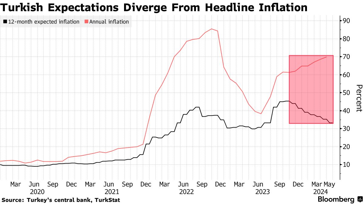 在二十国集团中名义利率最高的国家终于开始影响到一个经济体,该经济体不得不应对世界上最快速通胀水平之一。而在土耳其罕见的是,尽管价格持续加速,但通胀预期一直在下降。