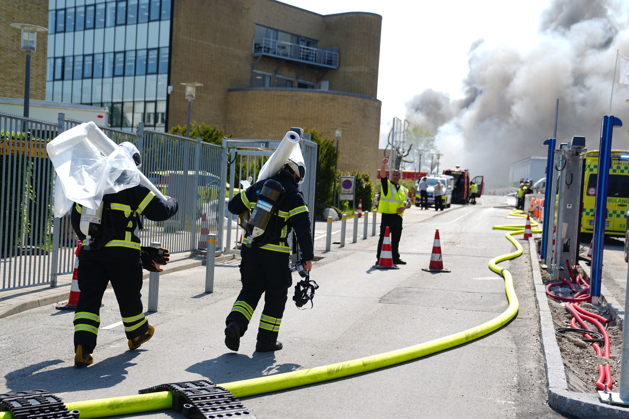 消防员在丹麦巴克斯瓦德Novo Nordisk总部发生火灾的现场,时间是5月22日。摄影师:Liselotte Sabroe/AFP/Getty Images