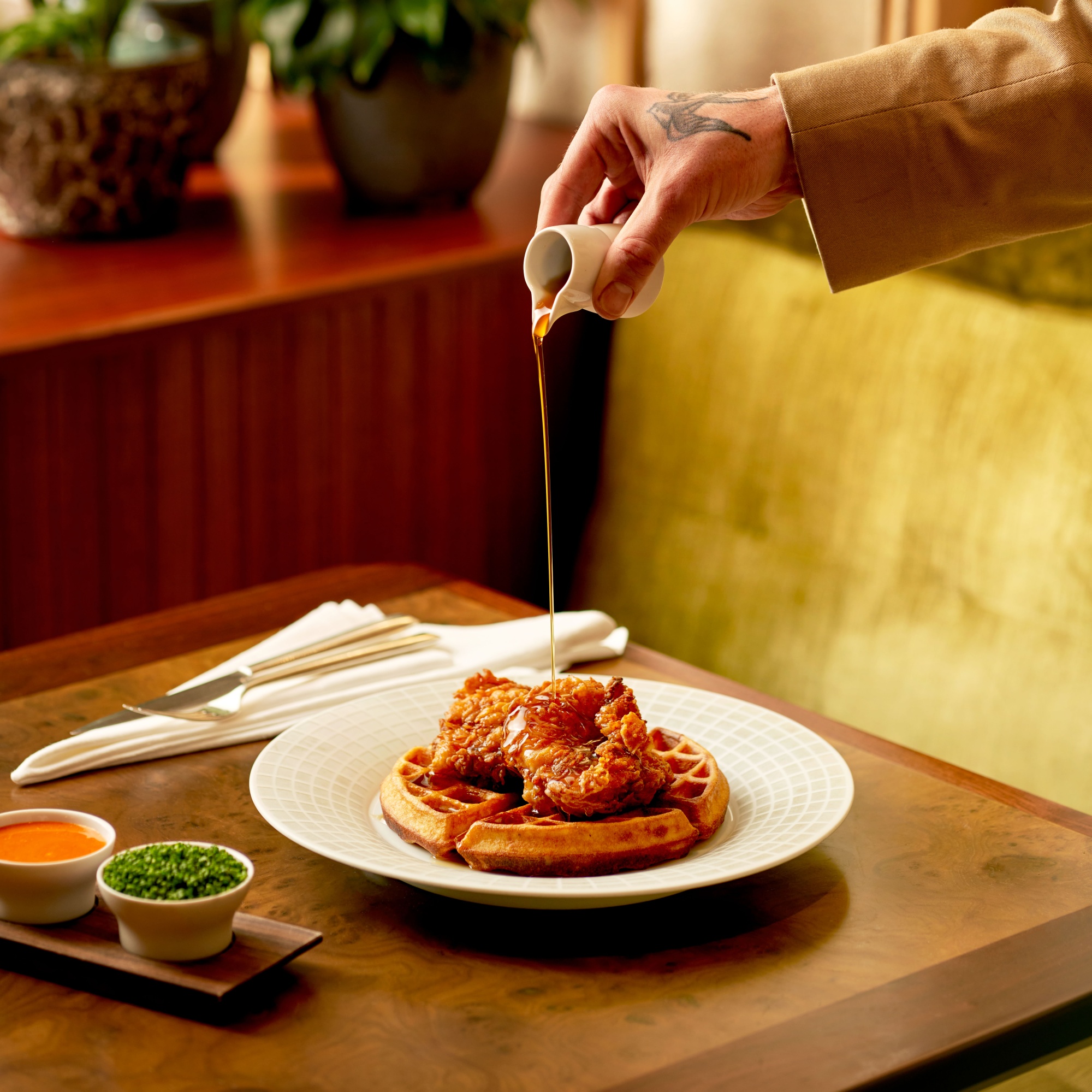 在Dovetale,全新的选择是早午餐炸鸡。摄影师:Milo Brown在Dovetale,汤姆·塞勒斯(Tom Seller)在1 Hotel Mayfair的漂亮餐厅,推出了全新的星期六早午餐菜单;其中心是配有华夫饼和热黄油酱的炸鸡。葡萄酒总监马特·埃斯佩森(Matt Espersen)表示,与这道菜搭配的饮品是香槟,灵感来自极具脆度的美国KFC品牌:“早午餐必备气泡酒。”