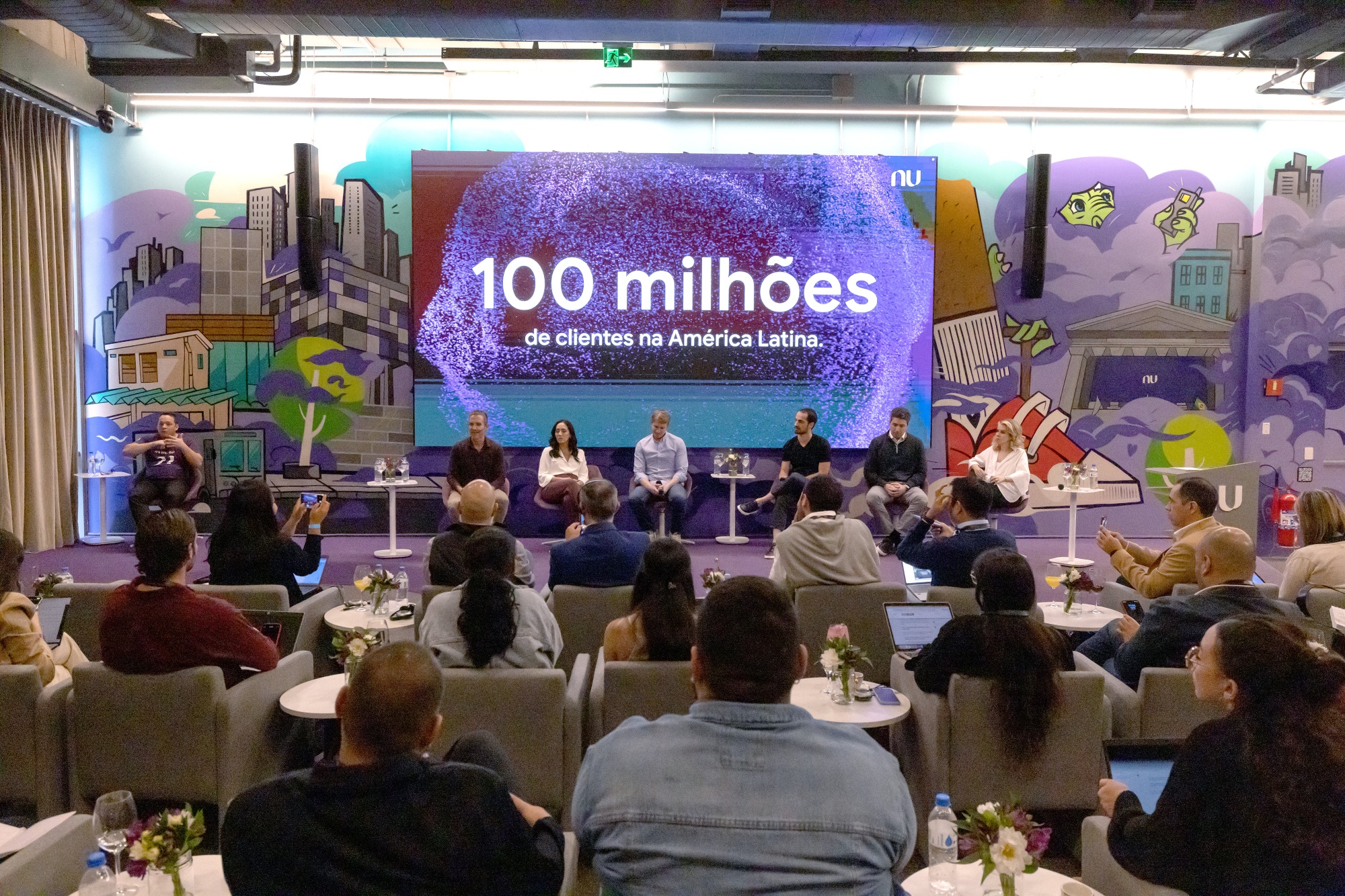 在 Nubank 圣保罗总部的活动中 —— 这里的一切都是紫色的 —— Velez 主持了舞台,用不同语言在大屏幕上向客户致意。