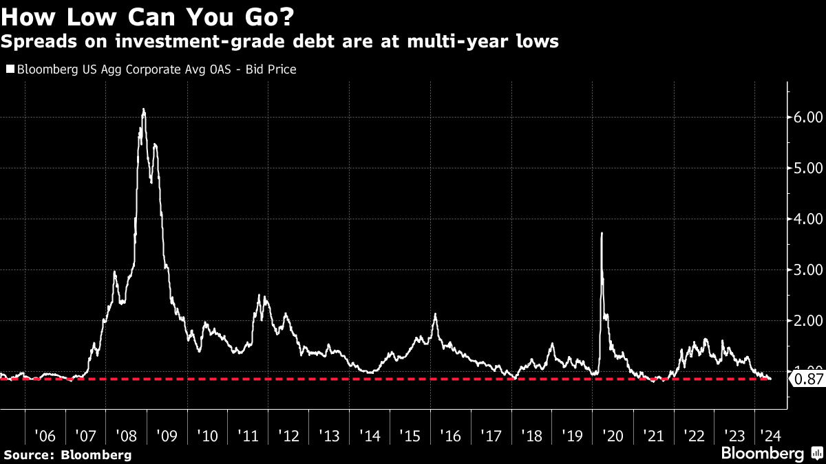 到目前为止,这一情况尚未出现,相反,根据CreditSights Inc.的数据,2023年成为有记录以来堕落天使最少的一年,仅有191亿美元的美国债券从投资级降至高收益级别。由BBB评级公司发行的数十亿美元债务反而在最近几个月被升级,因为这些公司继续加固其资产负债表。升级潮涌现如此之大,以至于一些分析师认为,尽管基准利率达数十年来最高水平,但这有助于保持企业债务的风险溢价或利差较低。