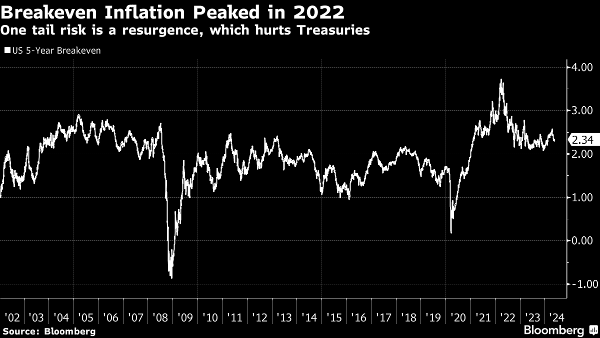 我不会忽视这种可能性,因为现在的通胀预期比通胀最近高峰时期要低得多。但是,如果我们看看将通胀保护国债的回报与普通国债在5年期内对齐的盈亏平衡率,我们仍然高于过去15年的水平。这种更长期的市场衡量通胀预期的方式也是我们在过去20多年中在疫情之外看到的最高水平之一。你需要迫使美联储再次加息才能使数字比目前增长超过半个百分点。所以我不认为这是一个重大的尾部风险。