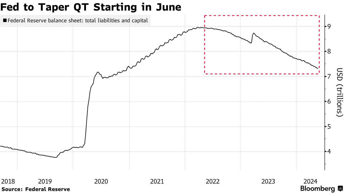 美联储表示,5月1日宣布,将降低每月允许到期而不再投资的美国国债上限,从600亿美元降至250亿美元,从6月开始。它将按照350亿美元的上限保持按揭支持证券。市场观察人士预计,美国国债的月度上限将降至300亿美元。