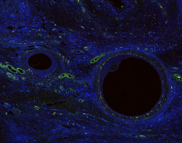 人类卵巢的横截面,识别了卵泡(黑色内部的圆形结构)、黄色的免疫细胞和绿色的血管。研究人员从识别的结构中收集了转录数据。(来源:Ariella Shikanov)这项研究的一个目标是帮助建立一个人工卵巢,这样一天可以帮助那些因年龄、疾病或其他因素而没有正常功能卵巢的患者进行生育。“我们仍然不知道如何将这些未成熟的卵泡培养成可以受精的成熟卵子,然后植入子宫,以便女性可以拥有生物相关的后代,”密歇根大学生物医学工程副教授、新研究的通讯作者Ariella Shikanov说。“通过创建这个蓝图,并真正了解这些生长卵泡周围发生的事情,我们希望能够在培养皿中重新创造这个非常微小的环境。”