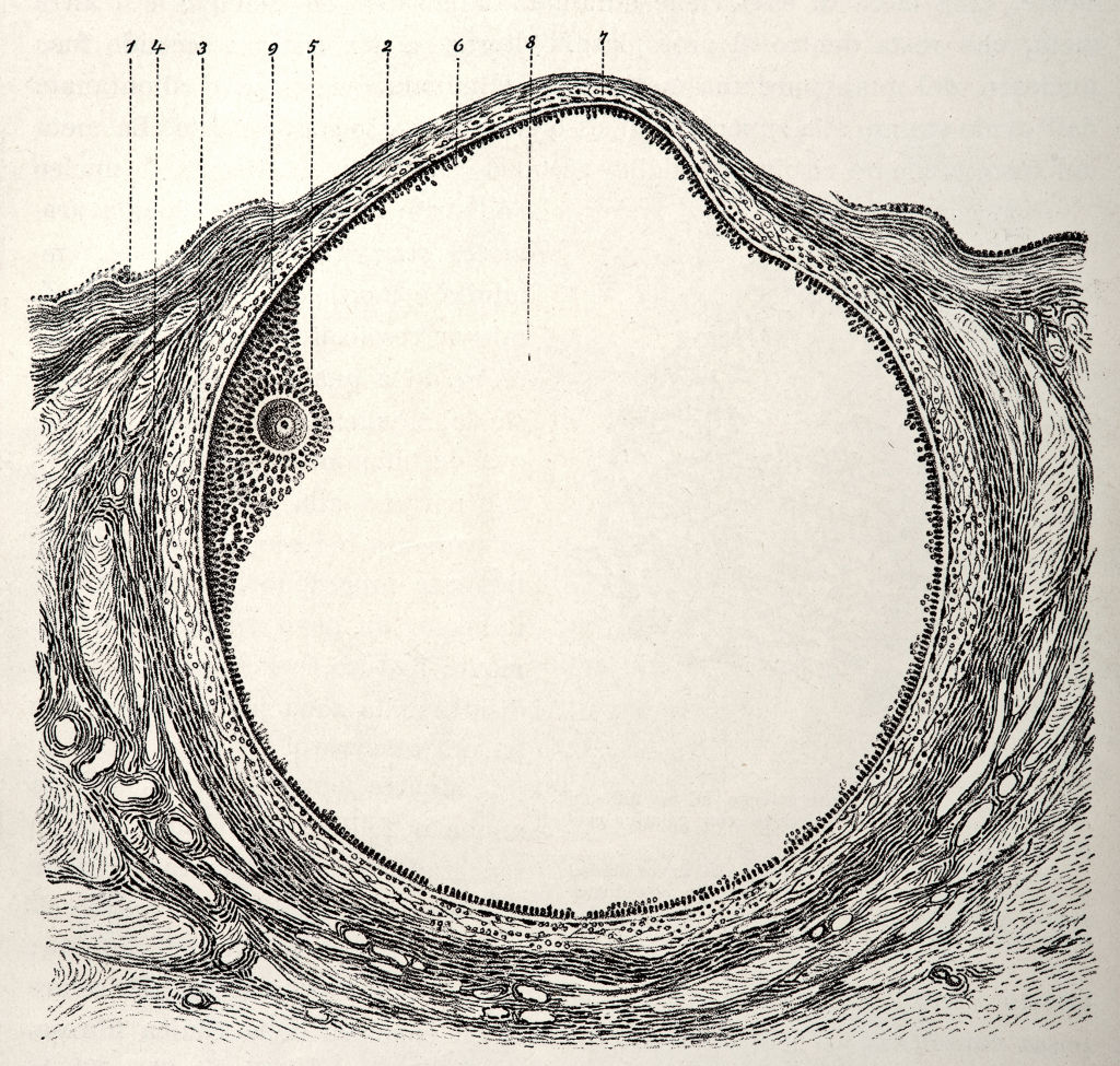 《产科学全书》(作者:埃斯内斯托·布姆和切萨雷·梅莱蒂)中的医学插图展示了卵巢卵泡。