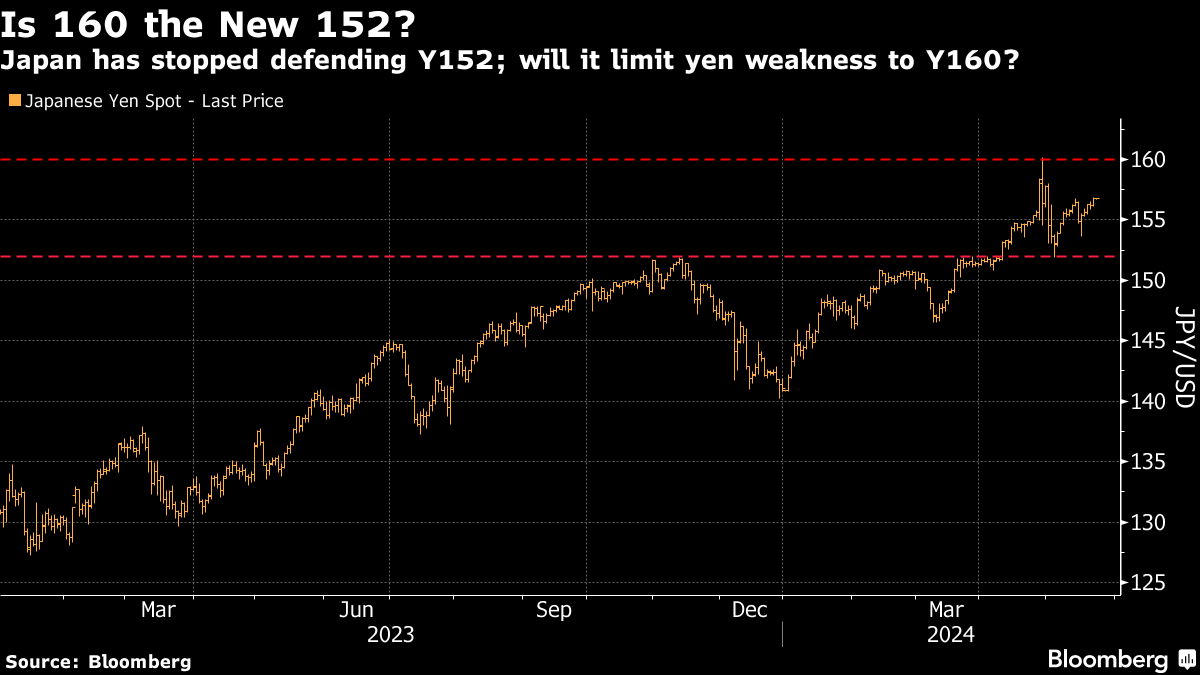 根据最近的市场走势,曾经的底线是每美元152日元。现在更接近每美元160日元,正如这张终端图表所示:
