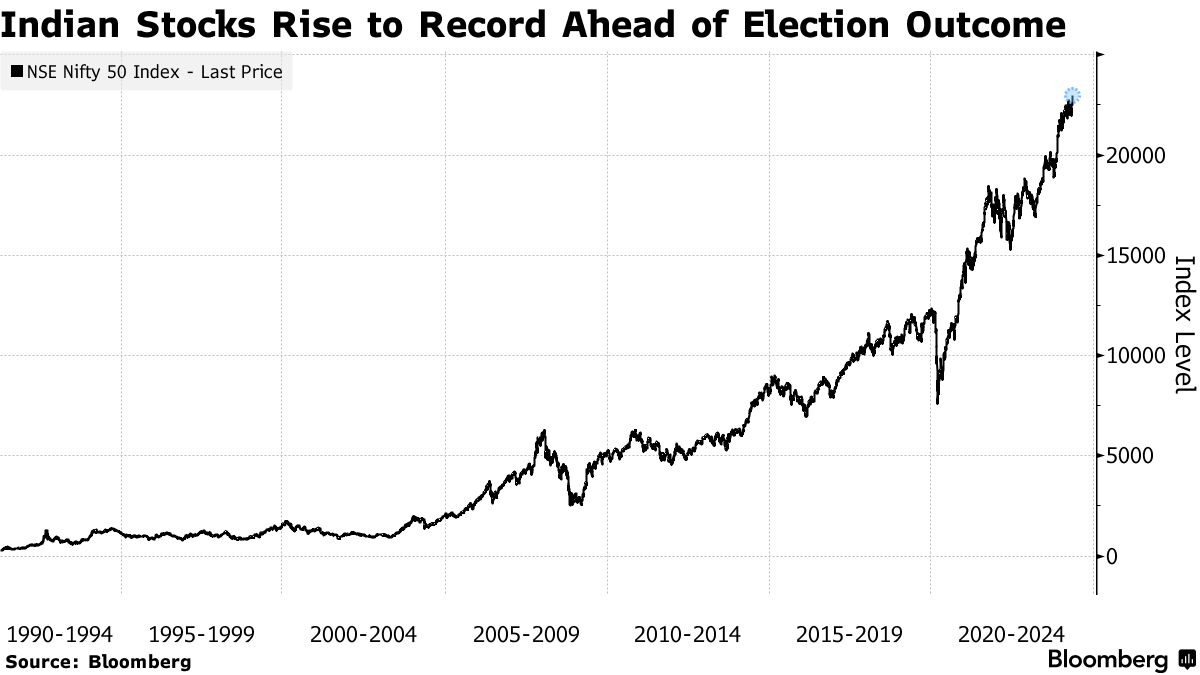 在莫迪告诉《经济时报》他的政党已经赢得了下议院543个席位中的272个,使他有望连任第三个任期后,情绪也得到提振。莫迪预测政党及其盟友将赢得超过400个席位,以确保经济改革的连续性。告诉《经济时报》。