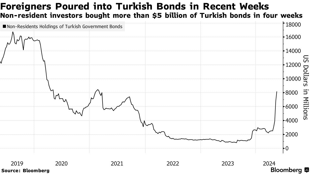 在货币正统和通胀下降的承诺鼓舞下,外国投资者在中央银行在3月份的会议上进行了一次超出预期的利率上调后,最近几周加大了对土耳其资产的购买。去年选举后的政策转变,总统雷杰普·塔伊普·埃尔多安任命了由前华尔街银行家梅赫梅特·西姆舍克领导的更加市场友好的经济官员团队,显著改善了外国投资者的情绪。