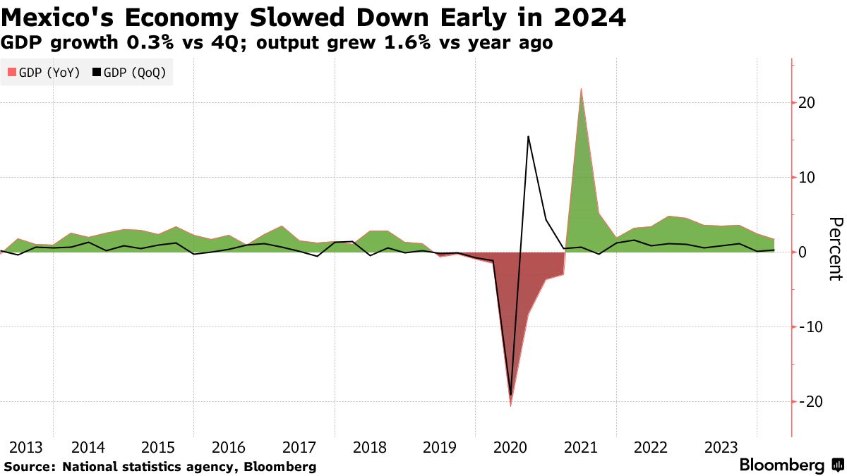 在去年大部分时间超出预期之后,墨西哥经济因出口需求疲软和恶劣天气对农业的影响而失去了动力。由于食品和服务价格上涨,头条通胀也加剧,这意味着央行减少利率的空间有限。综合起来,这些数据提醒了下一任总统将继承的困难的经济形势。