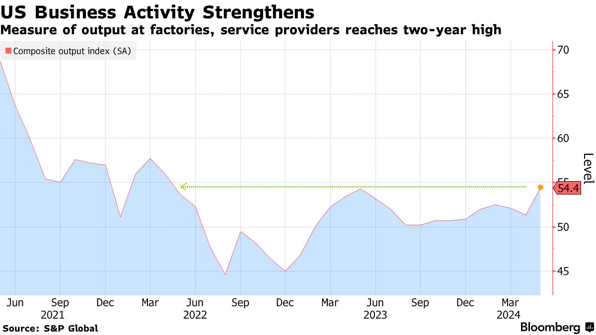标普全球五月初的复合采购经理人指数上升了3个多点,达到54.4,是自2022年4月以来最高的。高于50的数字表示扩张。该指数超过了经济学家在彭博调查中的所有预期。