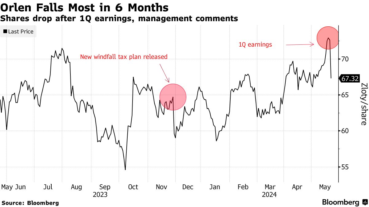 国有控股的奥伦SA周四下跌了多达8.4%,为11月29日以来最大跌幅,这导致股东价值损失67亿兹罗提(合17亿美元)。奥伦的第一季度利润低于分析师预期超过14%。