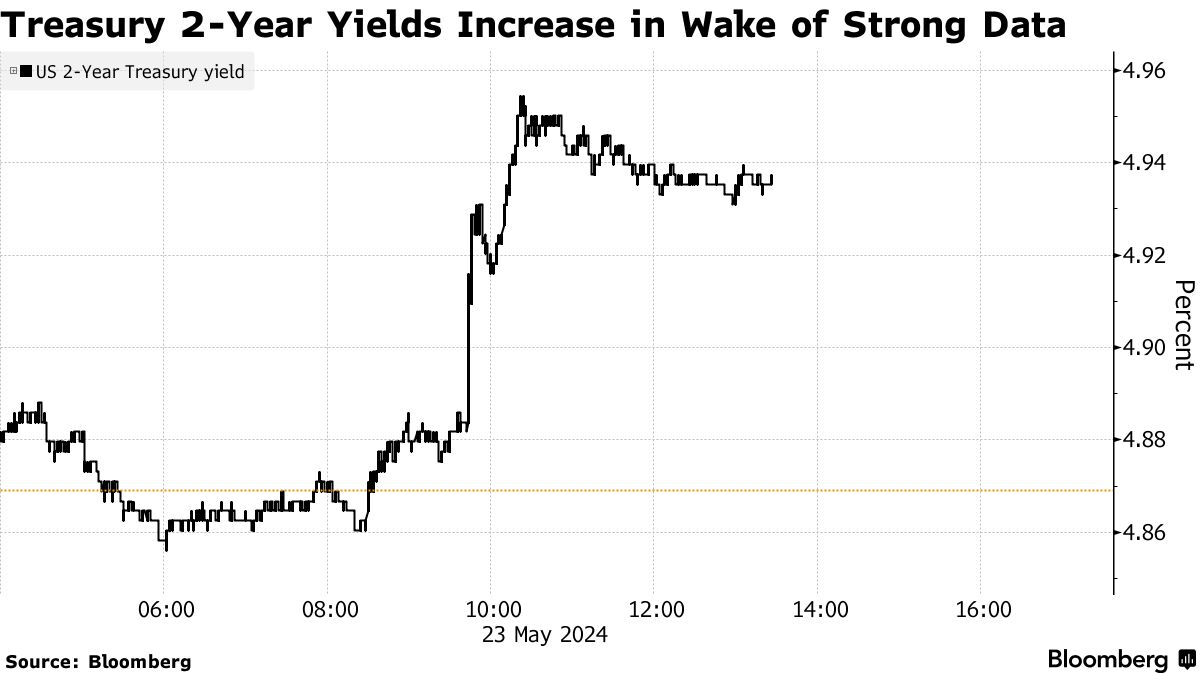美联储政策敏感的两年期收益率上涨超过8个基点,触及4.955%,为5月2日以来最高水平,稍后在纽约稍微回落。与此同时,各期限的利率至少上涨5个基点,导致收益率曲线变得扁平。交易量在即将到来的长周末之前低于平均水平,美国市场将在周一因阵亡将士纪念日放假。