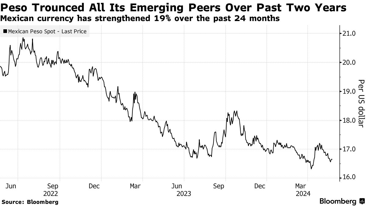 墨西哥比索已经成为过去24个月中表现最好的发展中国家货币,这归因于低波动性和高利率。