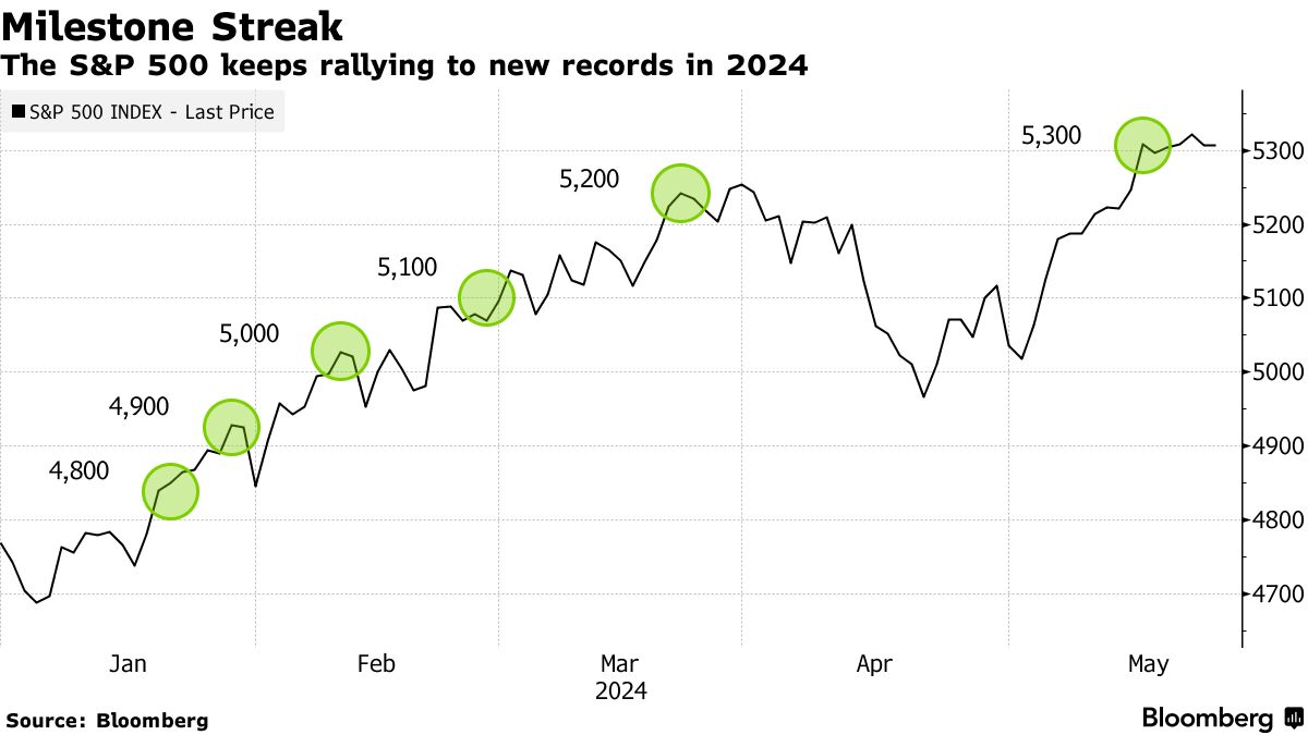 周四,标普500指数略有上涨,有望创下今年第25个纪录,此前Nvidia发布的销售预测高于预期,推动该公司股价突破了1000美元的里程碑。这一举动延续了标普500指数在五月份迄今为止超过5%的涨幅,这得益于美国企业强劲的财务业绩以及市场对美联储将在年底前放松政策的预期。