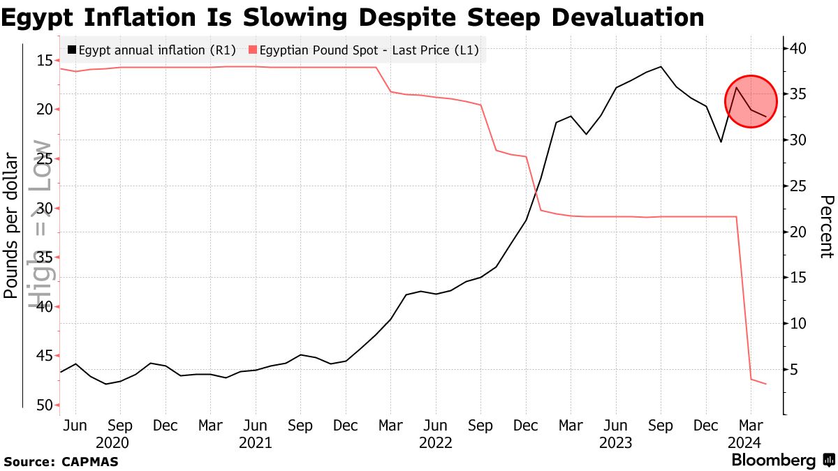 这一举措标志着埃及陷入困境的经济在第一季度有了喘息机会。在短短几周内,这个中东地区人口最多的国家让其货币兑美元贬值约40%,并从国际货币基金组织、阿联酋等国获得了约570亿美元的外国投资和援助承诺,最终为其摆脱了长达两年的危机。
