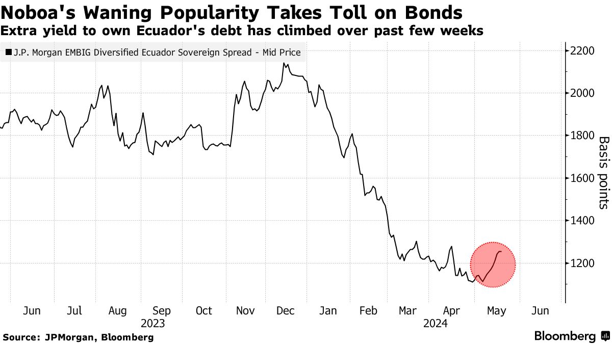 根据摩根大通的数据,五月份,投资者要求持有厄瓜多尔美元债券的额外收益率扩大了130个基点。根据彭博社编制的数据,过去一个月,该国债务是新兴市场政府债券中表现最差的之一,下跌了3.2%。