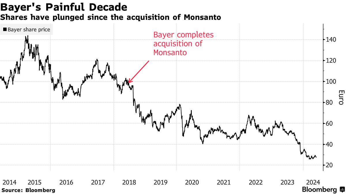 自孟山都收购以来,这家德国公司的股价已经下跌了超过70%,并且在周五早些时候在法兰克福进一步下跌了1.3%。