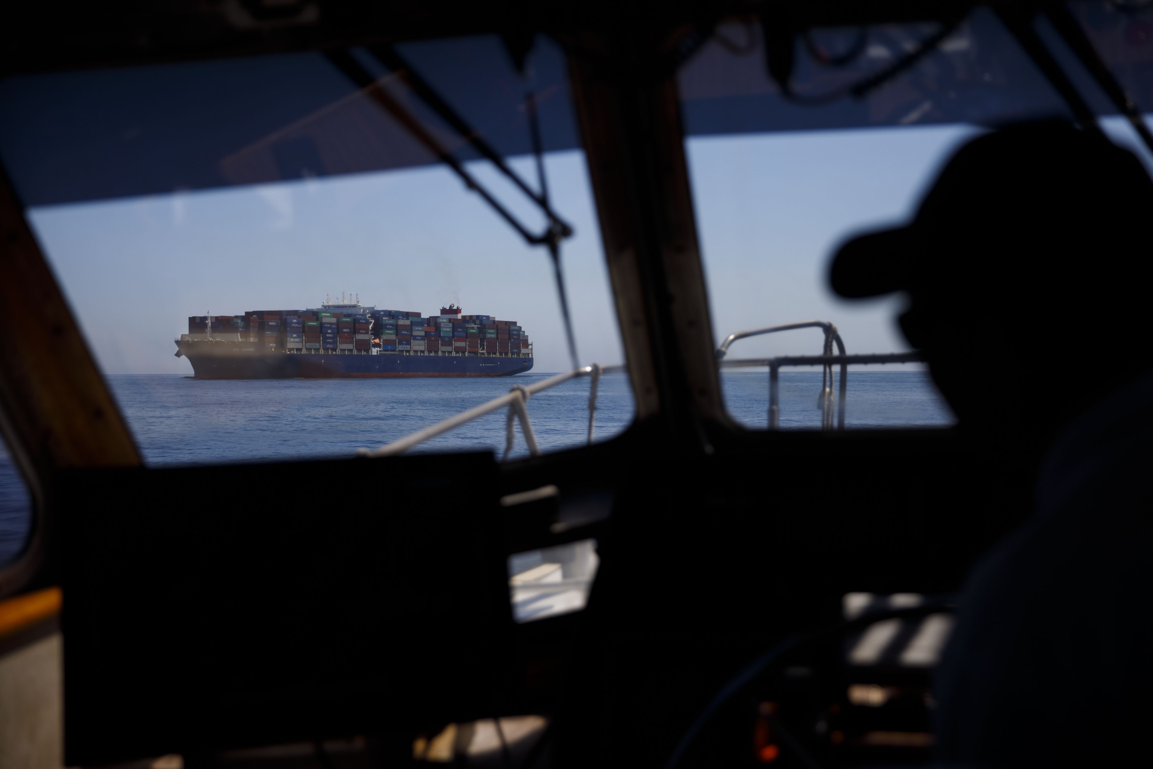 一个港口引航船船长驶向洛杉矶港外的一艘集装箱船。摄影师:Patrick T. Fallon/Bloomberg