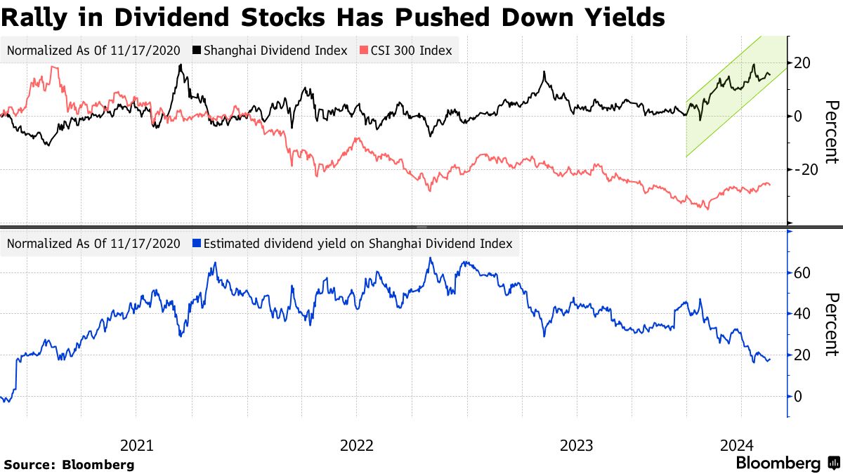 中国债券和股票都已连续数月上涨,投资者押注央行将进一步放松货币政策,同时一系列政府支持措施将有助于支持经济复苏。然而,对不确定经济前景的担忧仍然存在,这意味着投资者更倾向于选择股息股票而不是与增长相关的股票。