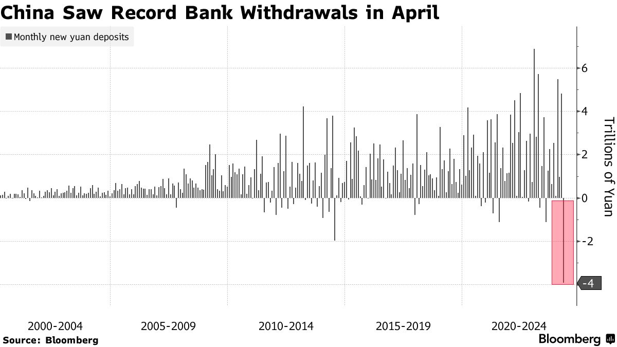 4月份总存款下降了3.9万亿元,其中1.9万亿元是家庭取款,根据央行数据。