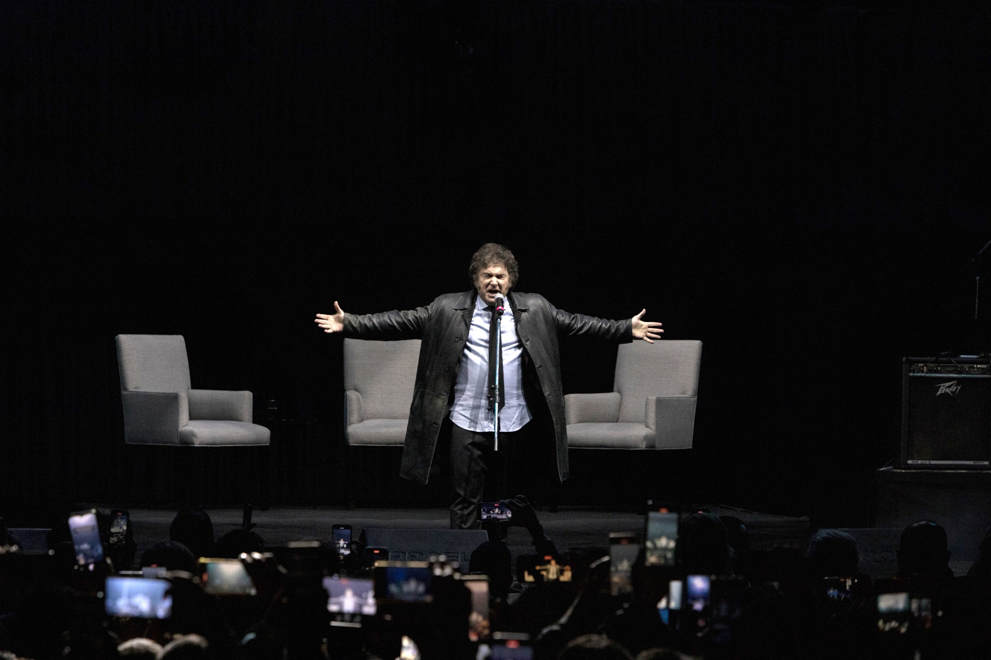 阿根廷总统哈维尔·米莱在布宜诺斯艾利斯一家竞技场的一次书籍发布会上讲话,时间是周三。摄影师:Anita Pouchard Serra/Bloomberg