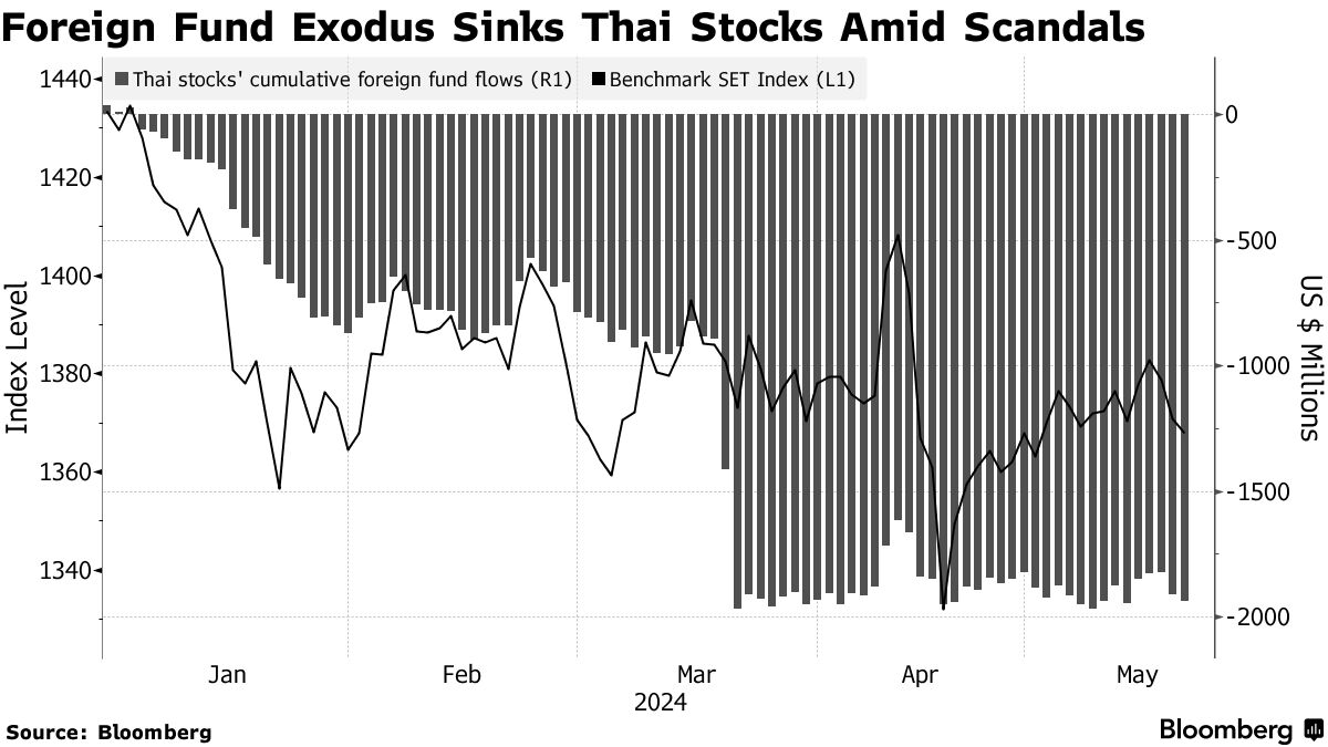 今年迄今为止,基准SET指数已下跌近4%,成为亚洲表现最差的指数之一,此前在2023年已下跌15%。国际投资者在2024年已撤出近20亿美元的本地股票,加上前12个月的55亿美元资金外流。