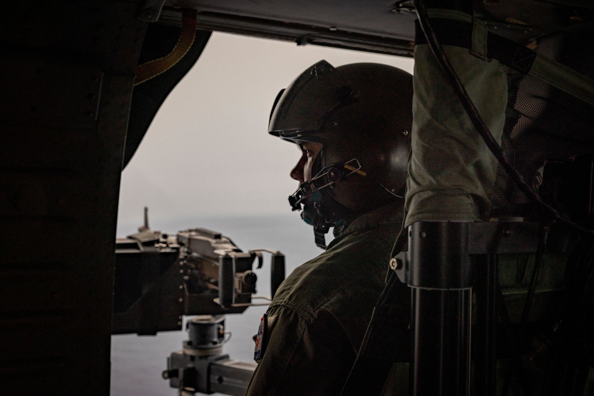 一名菲律宾空军直升机上的炮手飞越巴丹岛。
