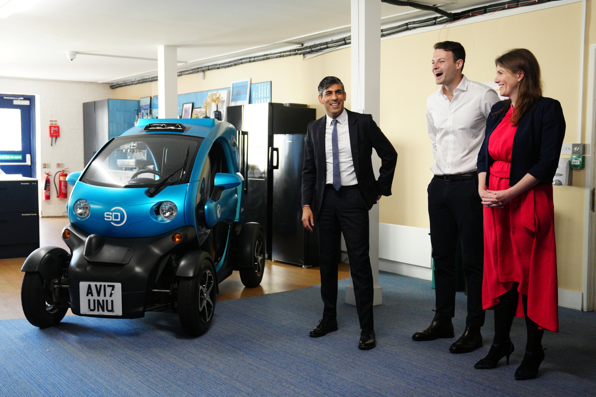英国首相里希·苏纳克;科学、创新和技术国务大臣米歇尔·多兰和Wayve的联合创始人兼首席执行官亚历克斯·肯德尔。