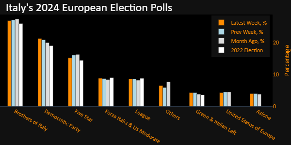 梅洛尼的意大利兄弟党在5月23日一周的欧盟民意调查中,支持率为26.9%,比前一周低0.2%,根据最新调查显示。反对党民主党在调查中获得最多支持,上升0.4个百分点至21.3%。