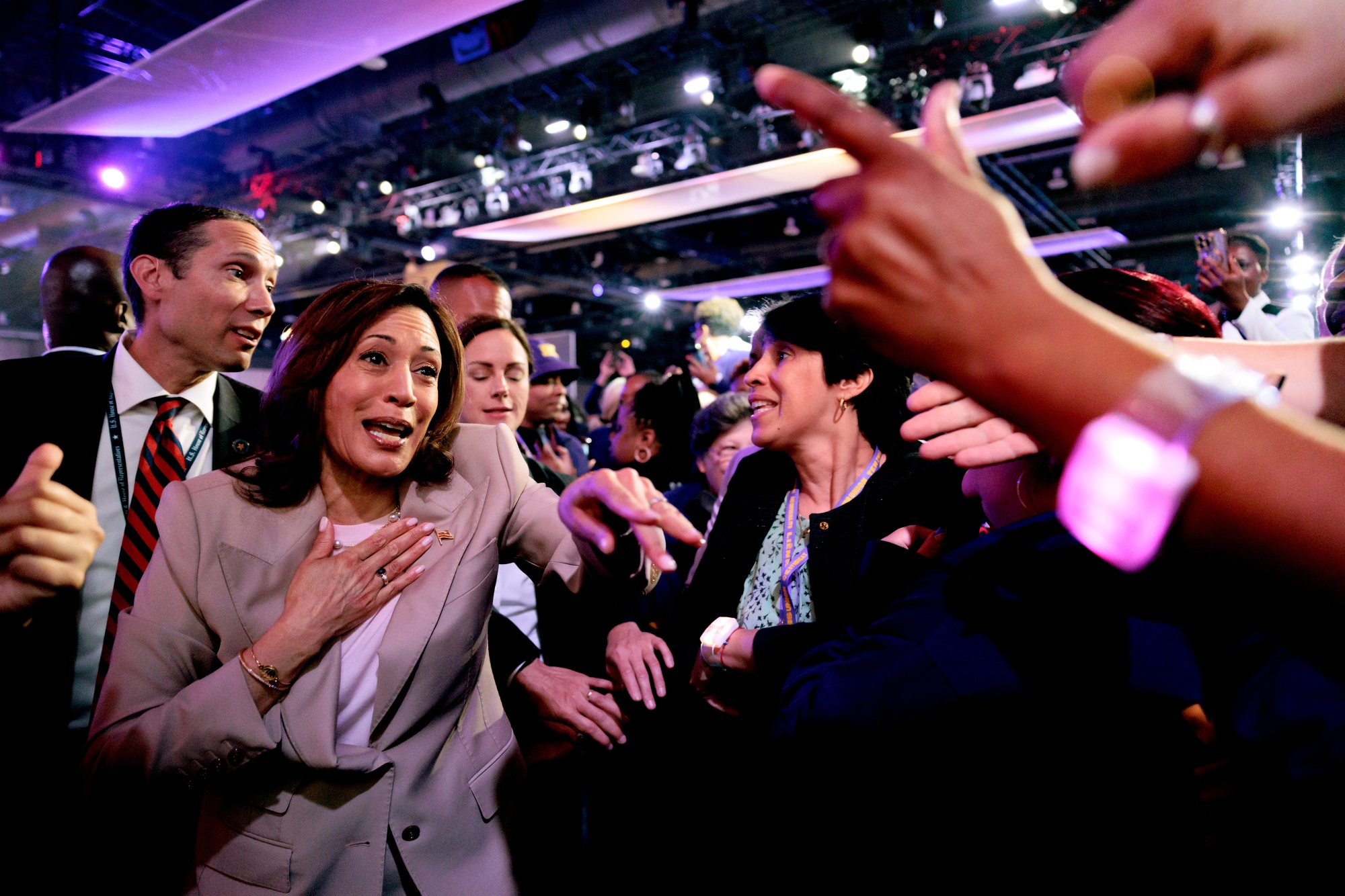 卡玛拉·哈里斯在5月21日的费城服务员工国际联合会大会上向与会者致意。摄影师:汉娜·贝尔/彭博社据一位熟悉策略的人士透露,哈里斯的活动经常受到与她圈外个人的闭门对话的影响。