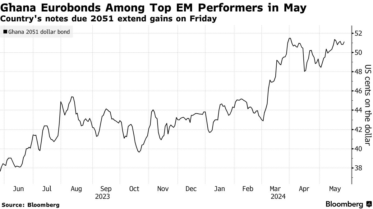 加纳的欧元债券是本月表现最好的新兴市场债券之一,周五继续上涨,到伦敦时间下午1:24时,到2051年到期的债券上涨了0.31美分,至每美元51.16美分。到2032年到期的债券上涨了0.20美分,至每美元51.17美分。
