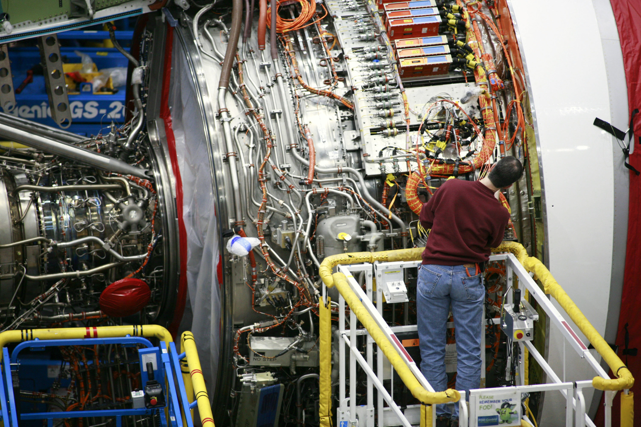 一名员工在波音公司位于华盛顿埃弗雷特的制造工厂的装配线上工作。