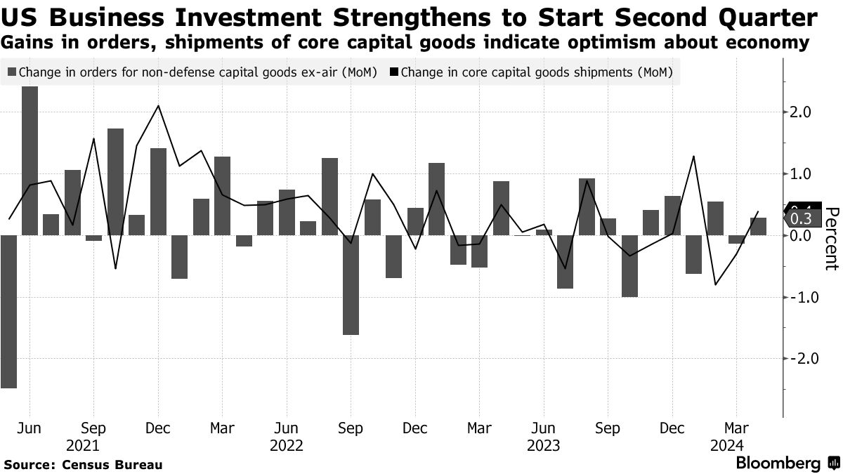 4月份向美国工厂下达的商业设备订单超过了预期,表明企业仍专注于进行长期投资,尽管前景不明朗且借贷成本高企。