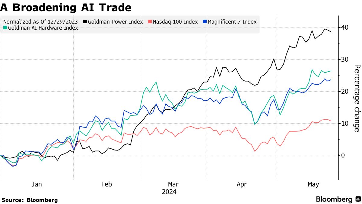 高盛与电力需求增长相关的一篮子股票今年已飙升40%,周五上涨0.8%,而与人工智能相关的硬件股票上涨27%,包括周五的0.7%涨幅。彭博七巨头总回报指数已经上涨24%,纳斯达克100指数上涨11%。