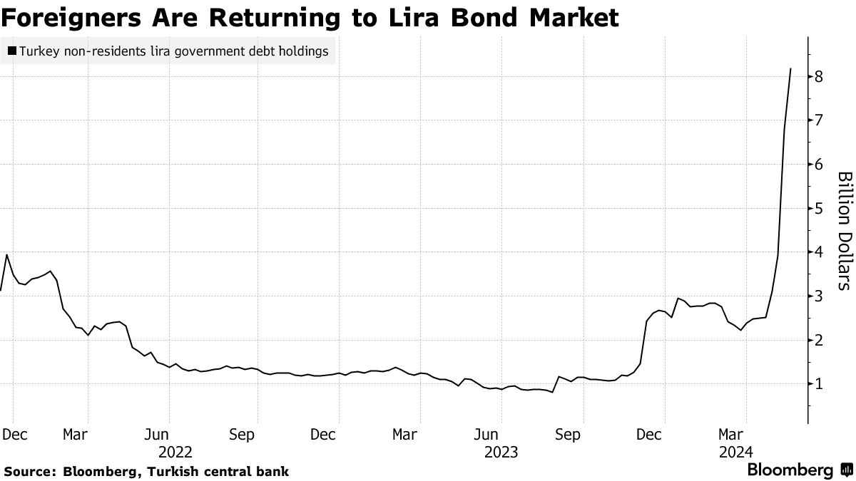 这一前景为投资者创造了巨大的套利机会他们在利率低的地方借钱,然后投资到利率高的地方。根据彭博经济学估计,自三月地方选举以来,与套利交易相关的土耳其资金流入增加了约160亿美元。