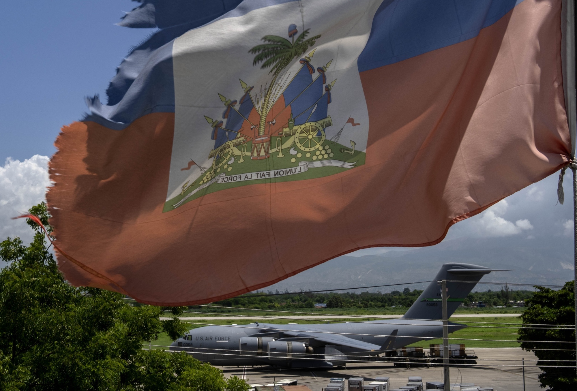 在5月11日,海地国旗在太子港杜桑·卢瓦图尔特机场附近的一架军用货机旁飘扬。