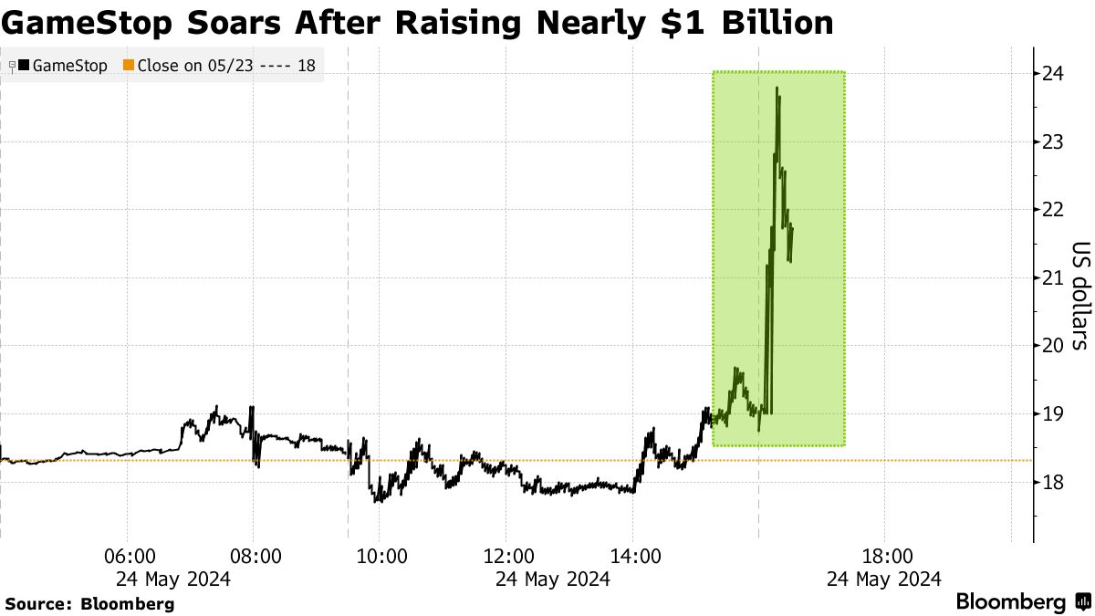 这家视频游戏零售商利用本月早些时候的交易热潮,出售了4500万股,筹集了大约9.33亿美元,根据周五的声明。股价在盘后交易中最高飙升了25%,达到23.80美元,但仍远低于5月14日达到的近65美元的峰值。