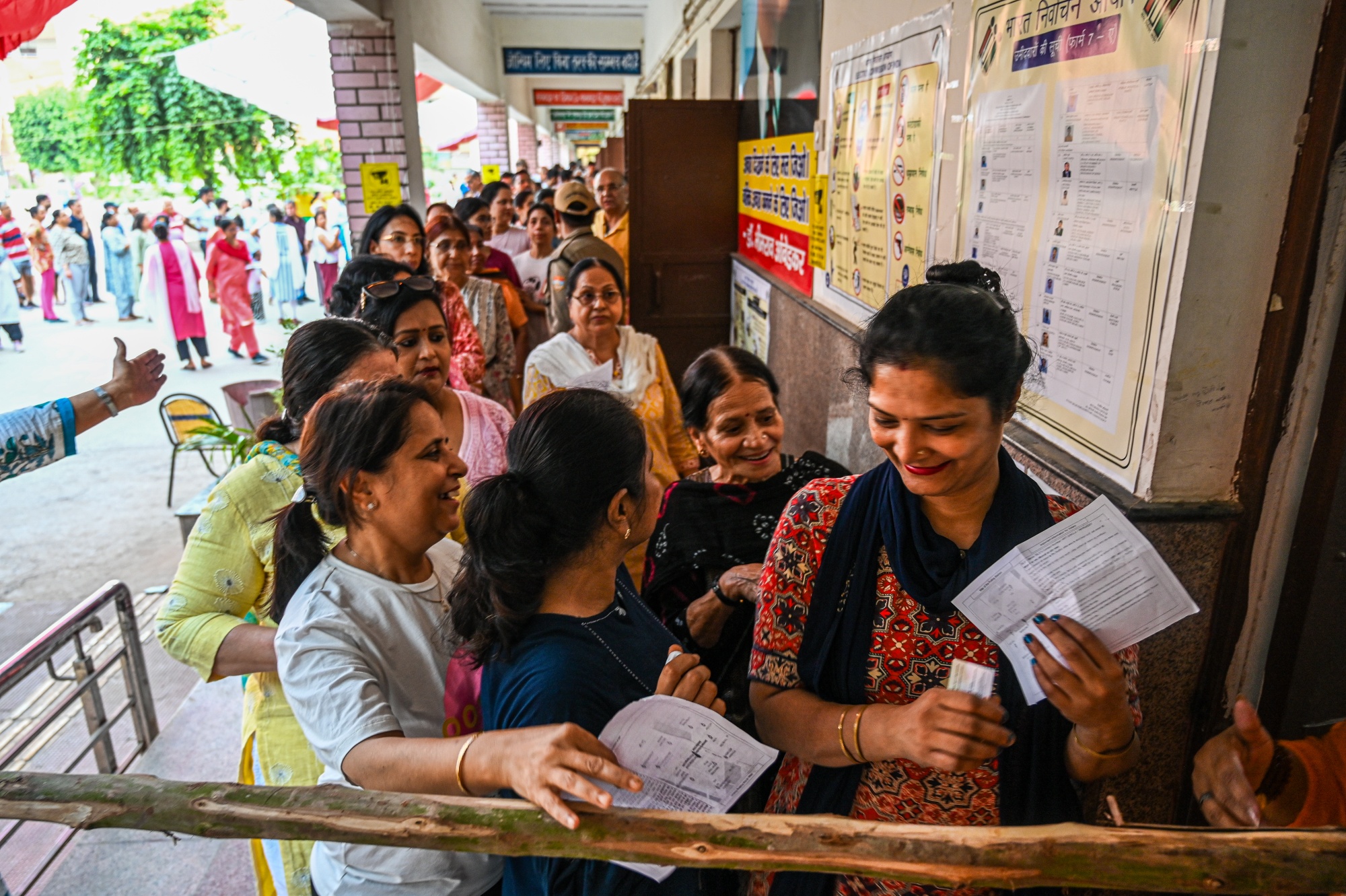 选民在5月25日德里全国选举第六阶段投票期间在投票站排队等候。摄影师:Prakash Singh/Bloomberg除了德里,整个哈里亚纳邦的居民,该邦派出10名议员到议会,也在周六投票。查谟和克什米尔邦的最后一个选区,安南塔格-拉杰奥里,也在周六投票。选举具有重要意义的北方邦阿扎姆加尔、巴多伊和舍拉瓦斯蒂也在投票。根据印度选举委员会的初步估计,第六阶段的平均选民投票率约为61%。